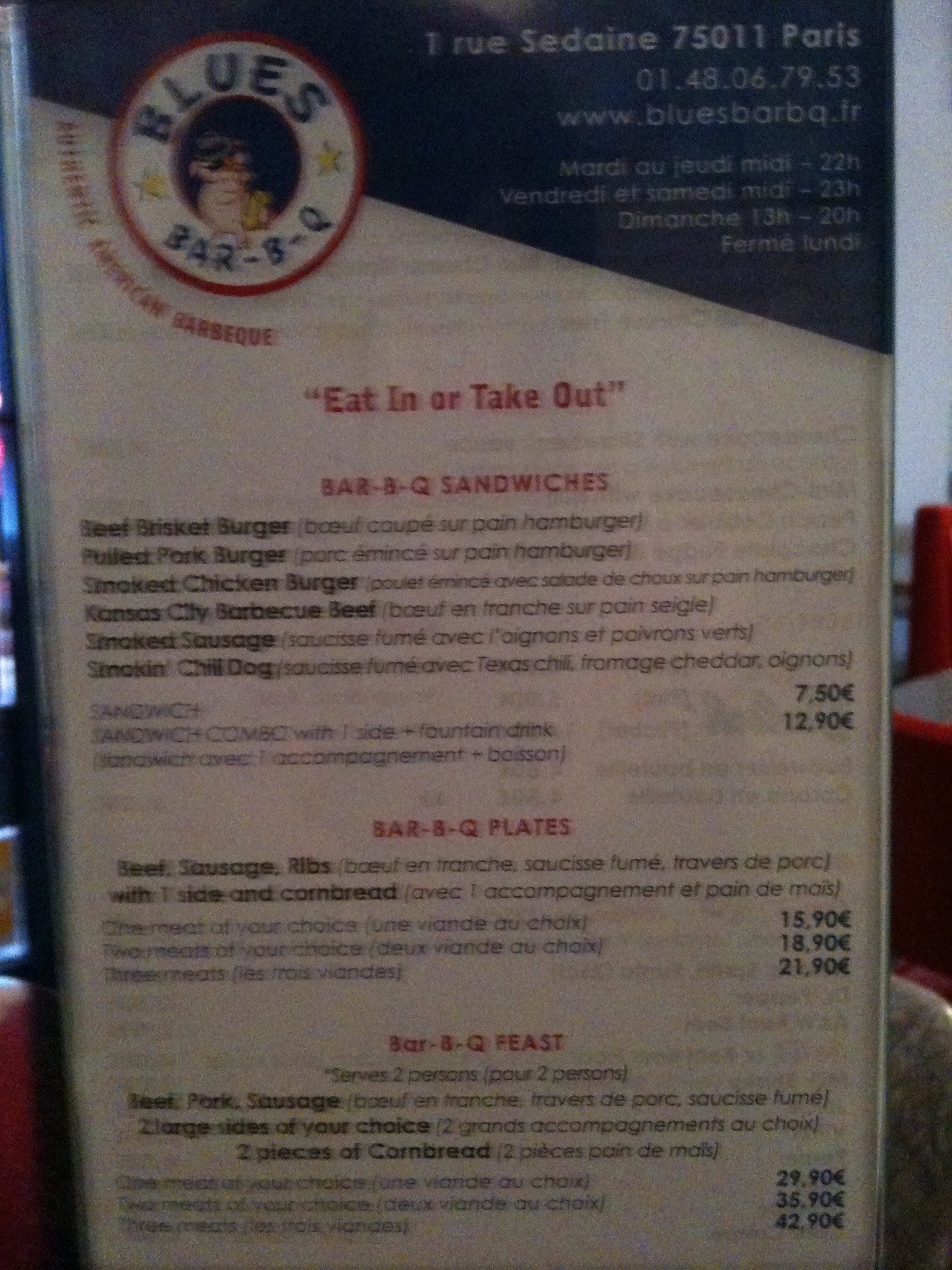 Most people know I love BBQ, especially what I consider to be the ‘best’ – Carolina style chopped pork with eastern NC vinegar based sauce on a soft bun with cole slaw and hush puppies. I do appreciate tender ribs and other styles of BBQ, but nothing to me is better than that sandwich. So I was very excited to find Blues Bar-B-Q in Paris, even if it’s Texas style. Thanks to the Anthony Bourdain BBQ episode where he visits Kansas city, Texas and North Carolina, I now know the difference…and it was confirmed that, at least in the mind of Mr.Bourdian, Carolina is the BEST.